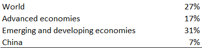 In total, this means that the cost of the pandemic will not be shared equally around the world. The output loss due to the pandemic will be 17% of 2019 GDP for Advanced economies, but will be almost twice as large, 31%, in Developing and Emerging economies. In Chinas, it will only be 7%: