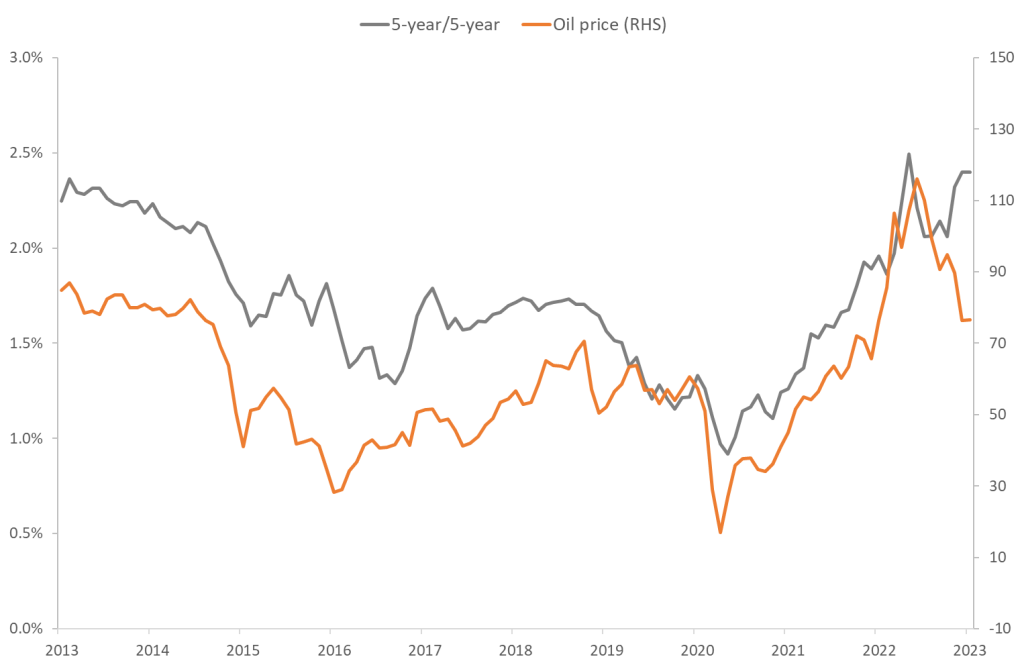 It is only natural that oil prices and current inflation rates are correlated, but it is somewhat intriguing that oil prices and expectations to inflation rates several years down the road are strongly correlated.